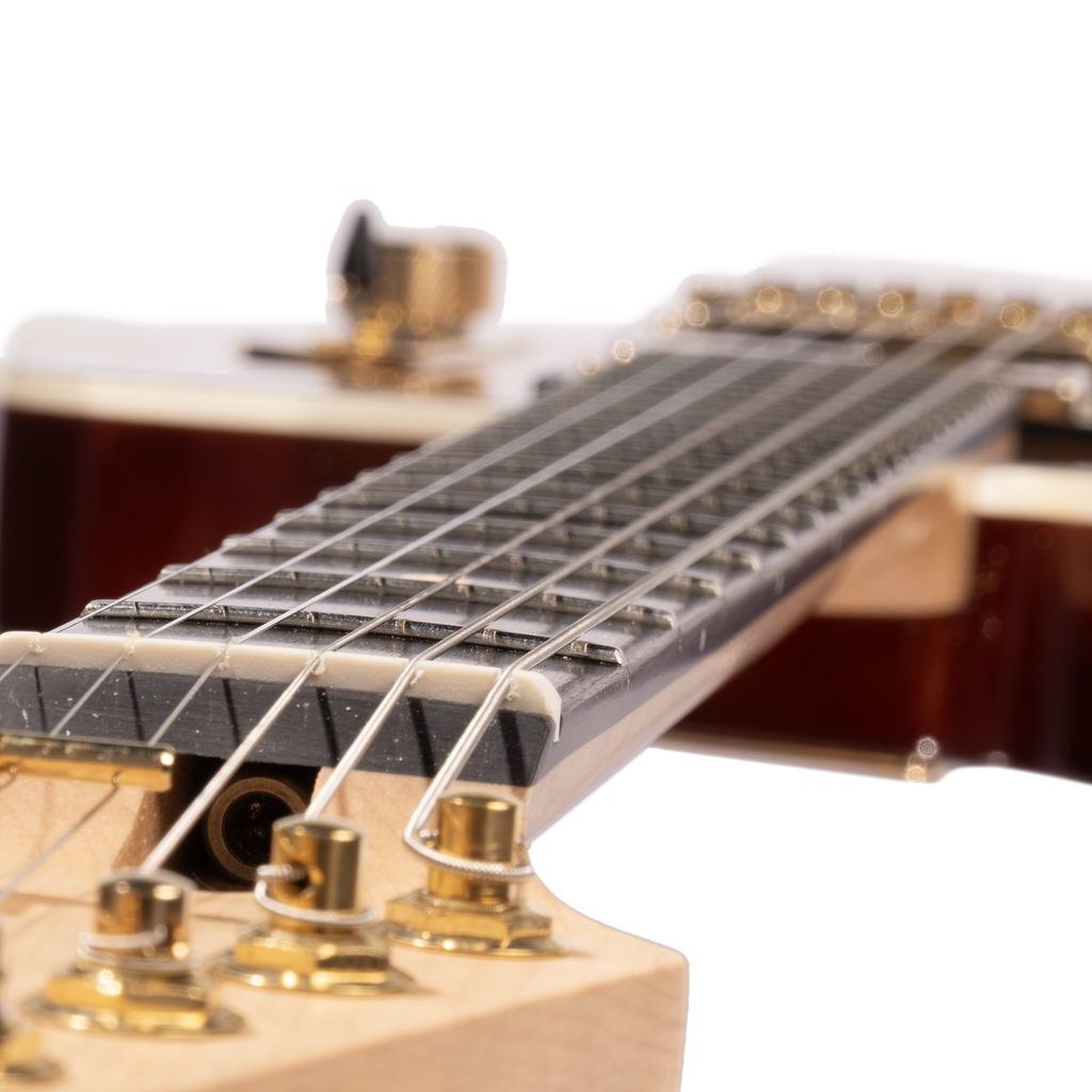 - Ebony fingerboard with twenty-two frets and a twelve-inch radius